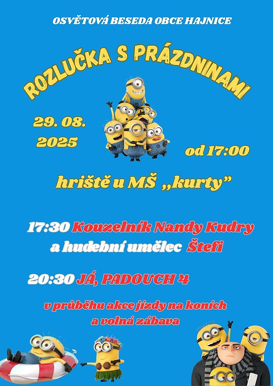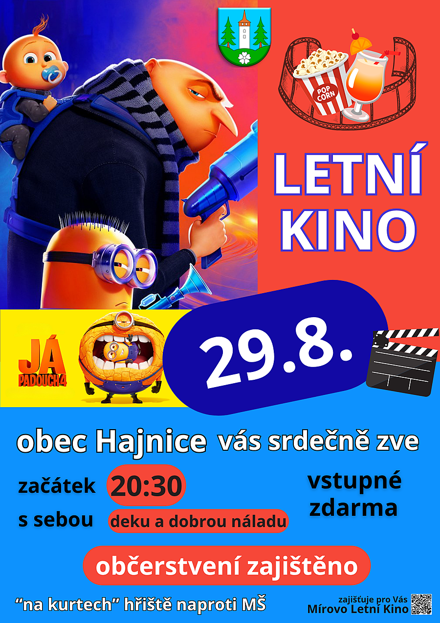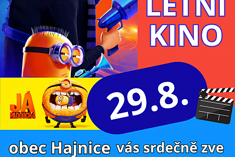 Léto se pomalu chýlí ke konci, ale v Hajnici se s ním rozloučí stylově! Přijďte si užít příjemný večer plný pohody, zábavy a dobré nálady na rozlučku s prázdninami, kterou zakončí promítáním letního kina pod širým nebem!