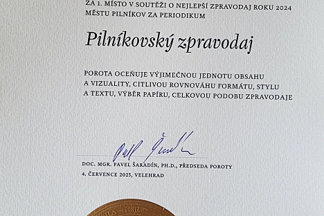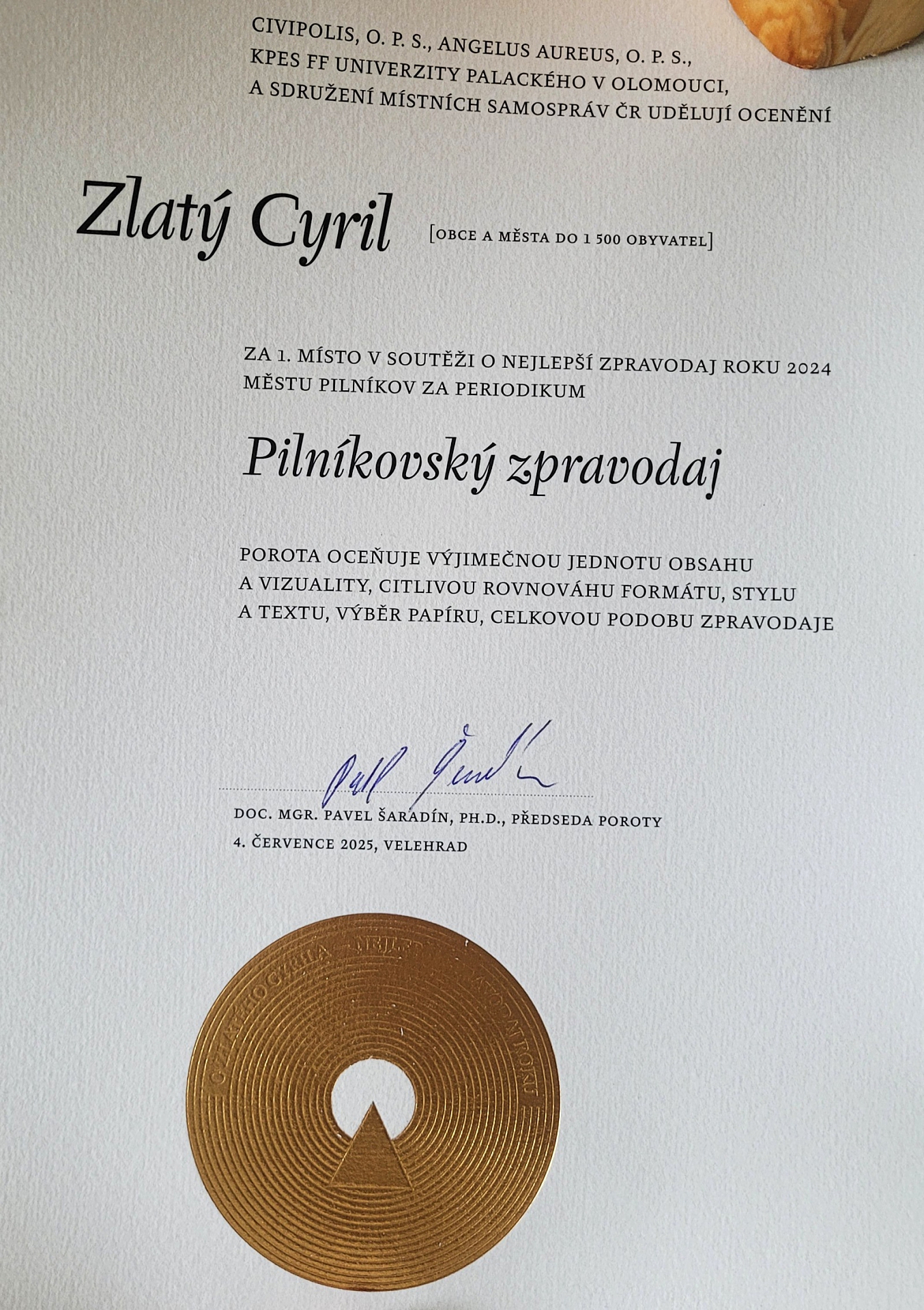 V rámci oslav Dnů lidí dobré vůle, které se konaly od 4. července 2025 ve Velehradě, jsme měli důvod k oslavě i my. V odpoledních hodinách jsme převzali dřevěnou, ručně vyřezávanou sochu Zlatého Cyrila za 1. místo v celostátní soutěži O nejlepší městský Zpravodaj roku 2024 (v kategorii obcí a měst do 1500 obyvatel). Navázali jsme tak na prvenství z roku 2021 a rozšířili naši sbírku ocenění, v níž nechybí ani 3. místo z roku 2023.