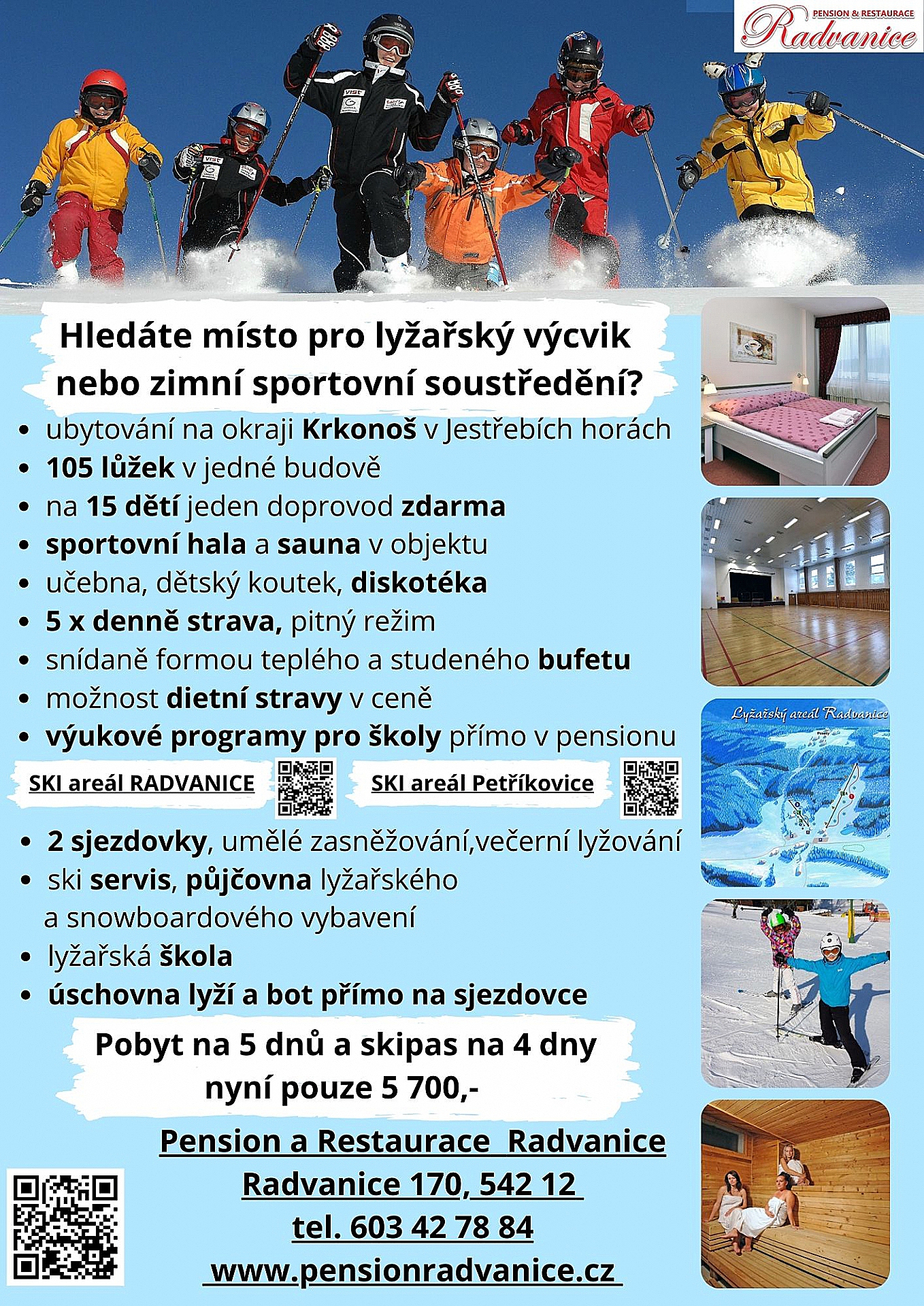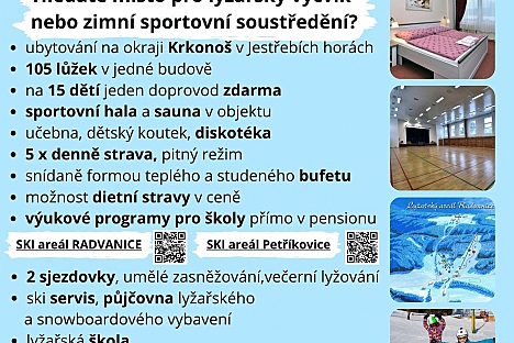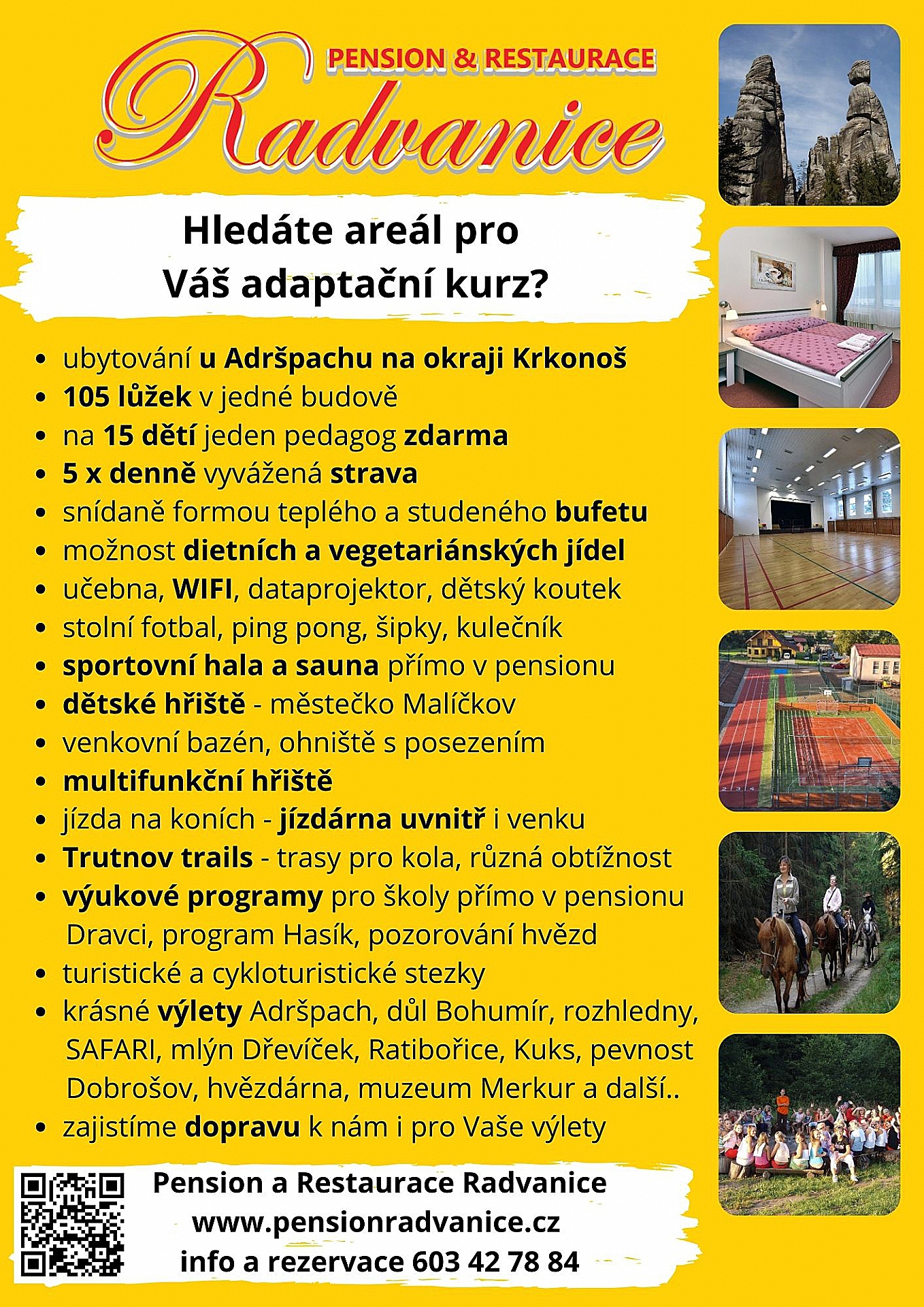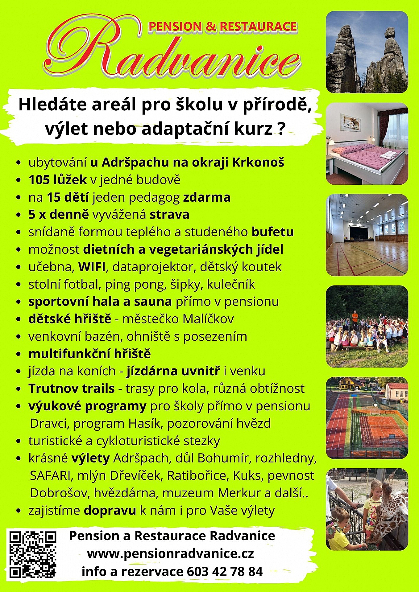 Převážná část programu bude probíhat v Pensionu Radvanice, který má školám rozhodně co nabídnout – bližší informace jsou na přiložených prospektech.