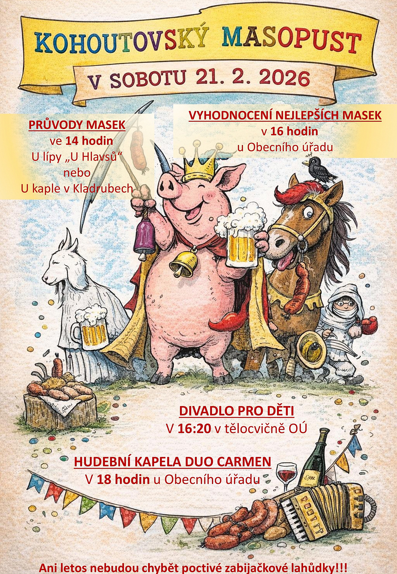 Přijďte si užít průvod masek, hudbu, divadlo pro děti a tradiční masopustní dobroty.