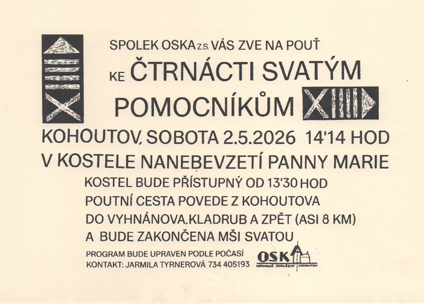 V sobotu 2. 5. 2026 pořádá spolek OSKA z.s. tradiční pouť v Kohoutově. Tato událost spojuje místní komunitu i poutníky z okolí při společném putování jarní krajinou.