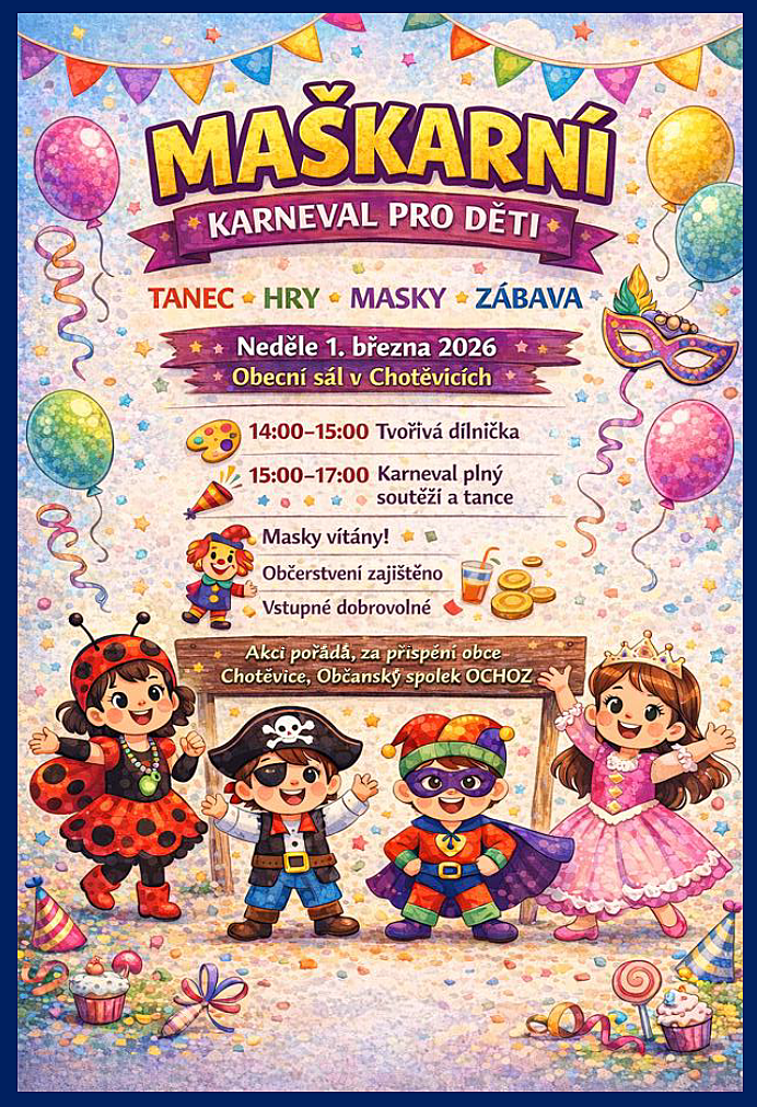 Občanský spolek OCHOZ za přispění obce Chotěvice zve všechny malé princezny, superhrdiny, piráty i berušky na veselý maškarní karneval plný her, soutěží a tance.
