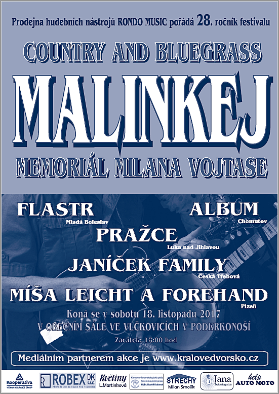 Prodejna hudebních nástrojů RONDO MUSIC pořádá 28. ročník festivalu Country and Bluegrass "MALINKEJ" memoriál Milana Vojtase. V sobotu 18. listopadu 2017 vystoupí v obecním sále ve Vlčkovicích v Podkrkonoší kapely Flastr, Album, Pražce, Janíček Family a Míša Leicht a Forehand z Plzně. Záčátek je v 18:00 hodin.