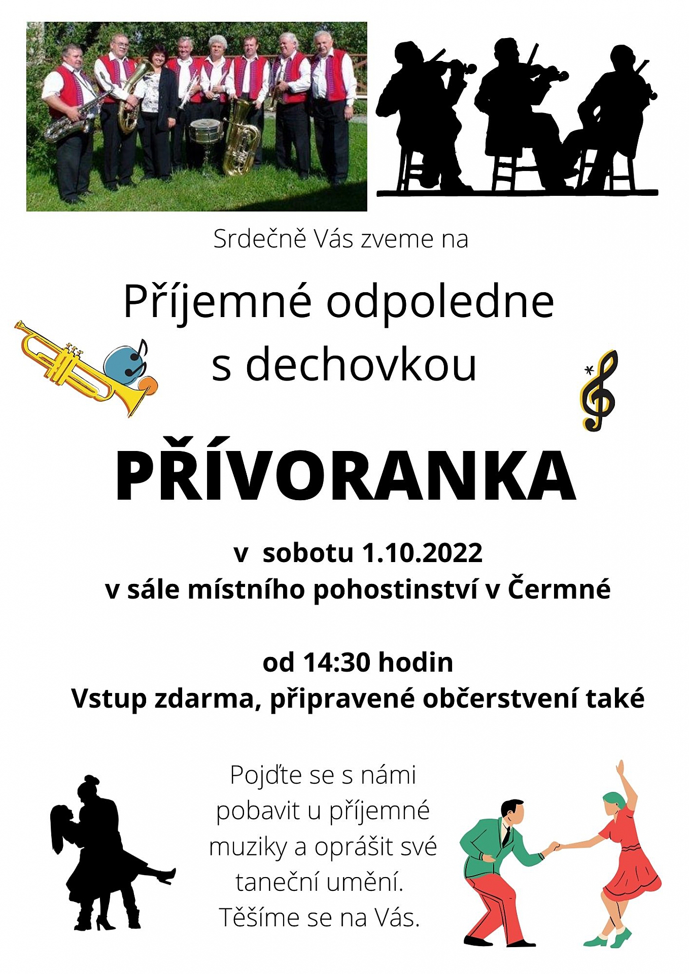 V sobotu 1. 10 2022 od 14:30 hodin v sále místního pohostinství v obci Čermná se koná odpoledne s dechovkou, zahraje skupina Přívoranka. Vstup zdarma. Drobné občerstvení zajištěno. Více informací na plakátu.