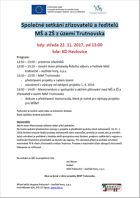 Vážení kolegové, starostové a starostky z území ORP Trutnov, ředitelé a ředitelky mateřských a základních škol! Dovolte, abych vás pozval na společné setkání zřizovatelů a ředitelů mateřských a základních škol v území ORP Trutnov. Toto setkání se uskuteční ve středu 22. listopadu 2017 od 13:00 hodin v Kulturním domě Havlovice. V průběhu dvou let jste byli průběžně informování o projektu MAP Trutnovsko, ke kterému jste se přihlásili a někteří se do něho velmi aktivně zapojili. Chceme vám představit výstupy projektu, které budou ovlivňovat vzdělávání v regionu a čerpání prostředků EU na modernizaci škol. Více najdete v pozvánce. Informace pro zřizovatele: v případě, že se nebude moci zúčastnit, pověřte svého zástupce - místostarostu, tajemníka či úředníka. Bylo by dobré, abyste byli informováni. Na setkání se těší Jan Balcar.
