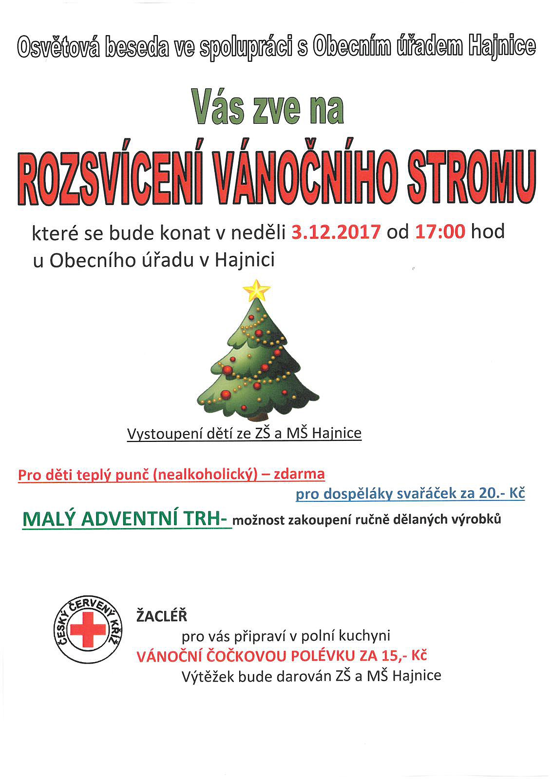 Osvětová beseda ve spolupráci s Obecním úřadem Hajnice Vás zve na rozsvícení vánočního stromu, které se koná v neděli 3. 12. 2017 od 17:00 hodin u Obecního úřadu v Hajnici. Akci zpěstří vystoupení dětí ze ZŠ a MŠ Hajnice. Příjemně naladit a zahřát se můžete svařáčkem za 20Kč, pro děti je nealko punč zdarma. V polní kuchyni ČČK Žacléř bude k mání vánoční čočková polévka, jejímž zakoupením přispějete ZŠ a MŠ Hajnice. Součástí bude malý adventní trh, kde můžete zakoupit ručně dělané výrobky.