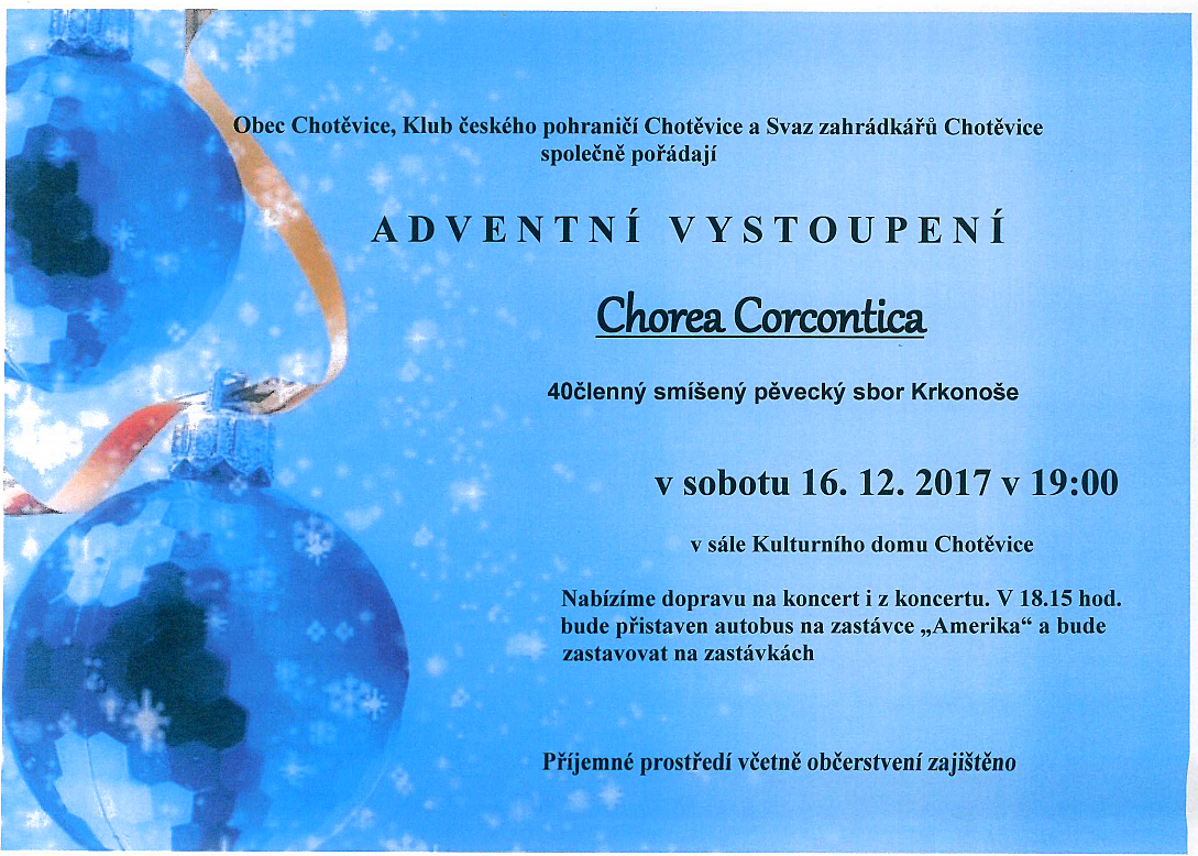 Jste srdečně zváni na adventní vystoupení "Chorea Corcontica" 40ti členného smíšeného pěveckého sboru Krkonoše. Akce se koná v sobotu 16. prosince 2017 v 19:00 hodin v sále Kulturního domu Chotěvice. Pro místní občany je připraven svozový autobus, který vyjíždí v 18:15 hodin ze zastávky "Amerika". Občerstvení je zajištěno.