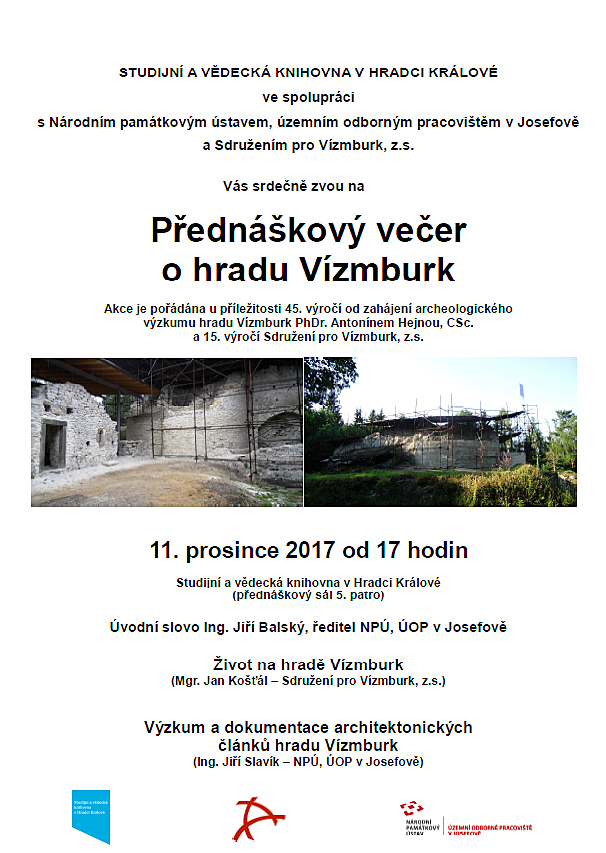 Jste srdečně zváni na Přednáškový večer o hradu Vízmburk, který se uskuteční v pondělí 11. prosince 2017 od 17:00 hodin v budově Studijní a vědecké knihovny v Hradci Králové (přednáškový sál 5. patro). Úvodní slovo pronese ing. Jiří Balský, ředitel NPÚ, ÚOP v Josefově. O životě na hradě Vízmburk pohovoří Mgr. Jan Košťál ze Sdružení pro Vízmburk, z.s. a výzkum a dokumentaci architektonických článků hradu Vízmburk přiblíží Ing. Jiří Slavík z NPÚ, ÚOP v Josefově.