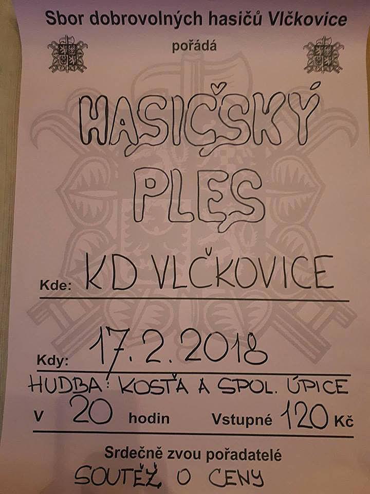 Obecní úřad Vlčkovice v Podkrkonoší a SDH Vlčkovice v Podkrkonoší Vás zvou na tradiční hasičský ples, který se koná 17. 2. 2018 v sále kulturního domu.