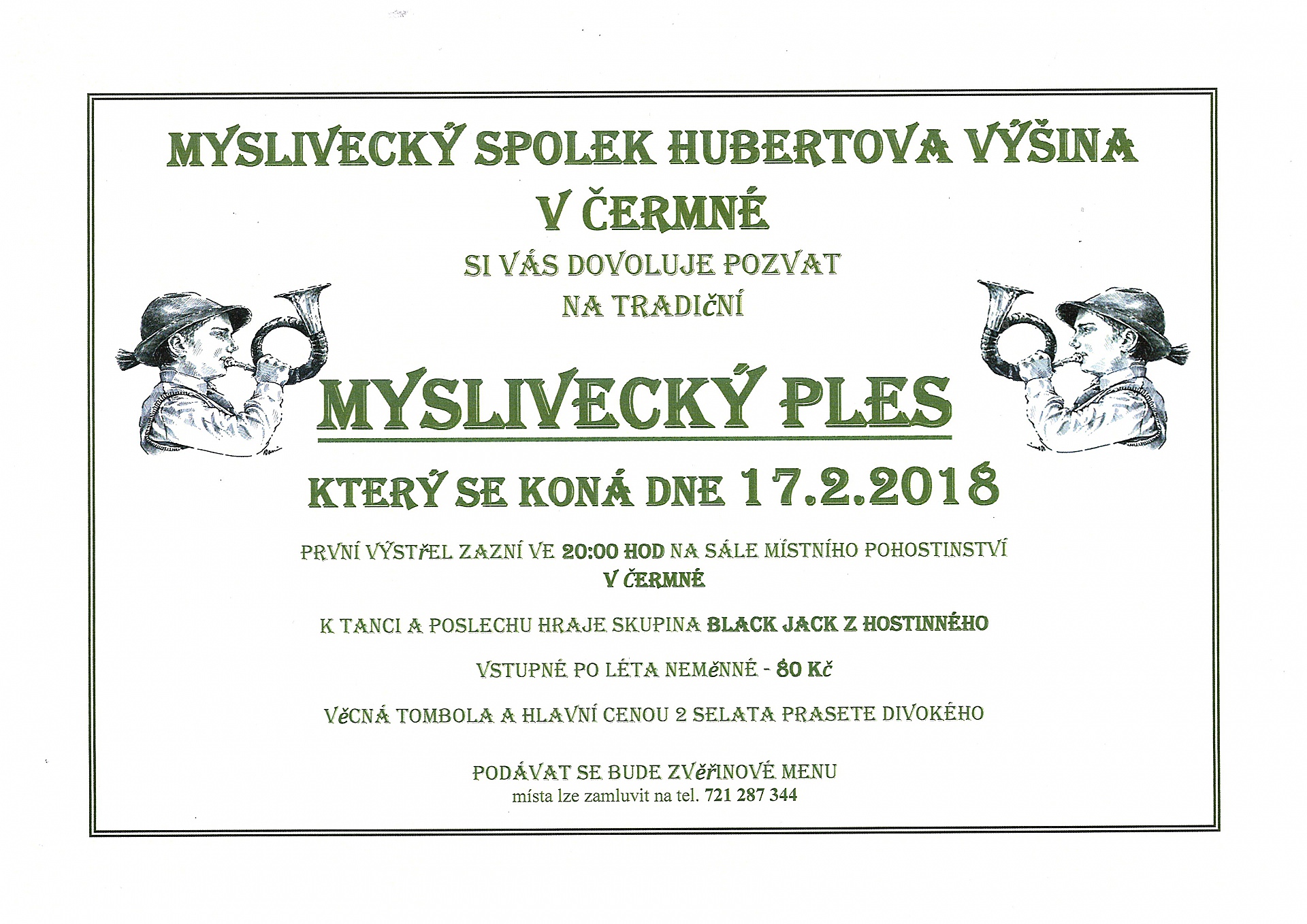 Myslivecký spolek Hubertova Výšina v Čermné si Vás dovoluje pozvat na tradiční myslivecký ples, který se uskuteční v sobotu 17.2.2018 od 20:00 hodin na sále místního pohostinství v Čermné. K tanci a poslechu hraje skupina Black Jack z Hostinného. Více informací na plakátu.