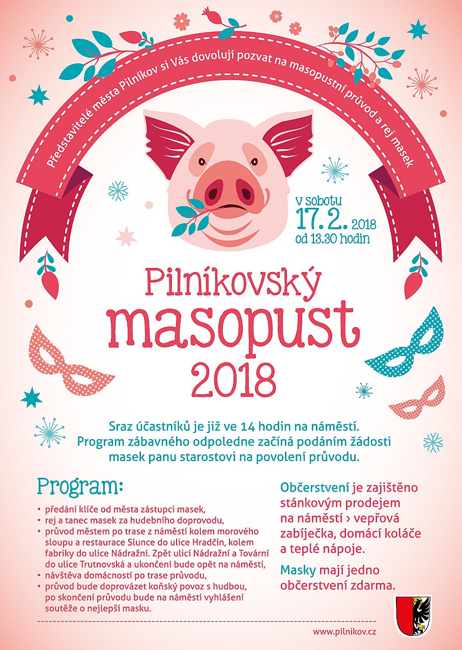 V sobotu 17. 2. 2018 se bude konat Masopust v Pilníkově. Čeká vás předání klíče od města, průvod městem a návštěva domácností na trase. Průvod bude doprovázet koňský povoz s hudbou. Občerstvení je zajištěno stánkovým prodejem. Více informací na plakátu.