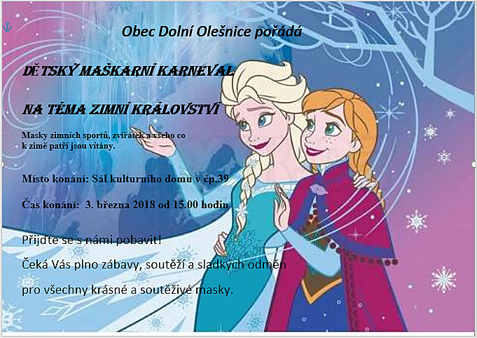 Obec Dolní Olešnice pořádá dětský maškarní karneval na téma Zimní království. Masky zimních sportů, zvířátek a všeho co k zimě patří jsou vítány. Přijďte v sobotu 3.2.2018 v 15:00 hodin do kulturního domu v Dolní Olešnici.