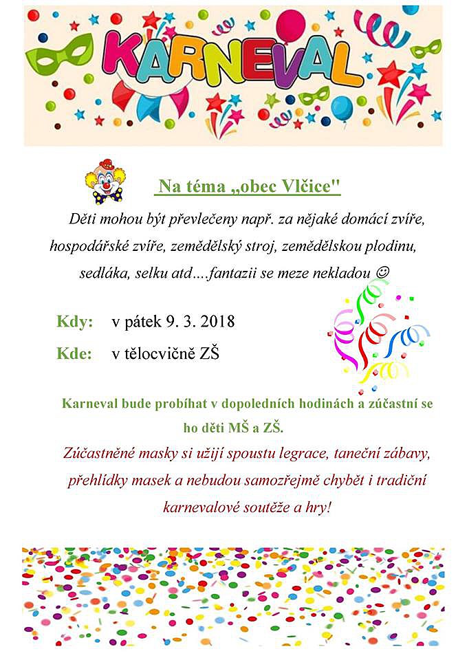 Karneval bude probíhat v dopoledních hodinách a zúčastní se ho děti MŠ a ZŠ. Děti mohou být převlečeny např. za nějaké domácí či hispodářské zvíře, zěmědělský stroj nebo zemědělskou plodinu, sedláka, selku atd.