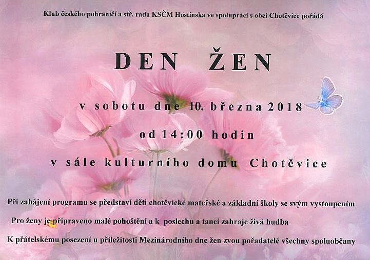 Klub českého pohraničí a stř. rada KSČM Hostínska spolu s obcí Chotěvice vás zvou na den žen