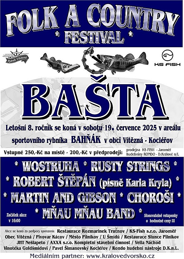 Areál rybníka Bahňák srdečně zve v sobotu 19. 7. 2025 od 16 hod. na festival FOLK a COUNTRY BAŠTA do Kocléřova.