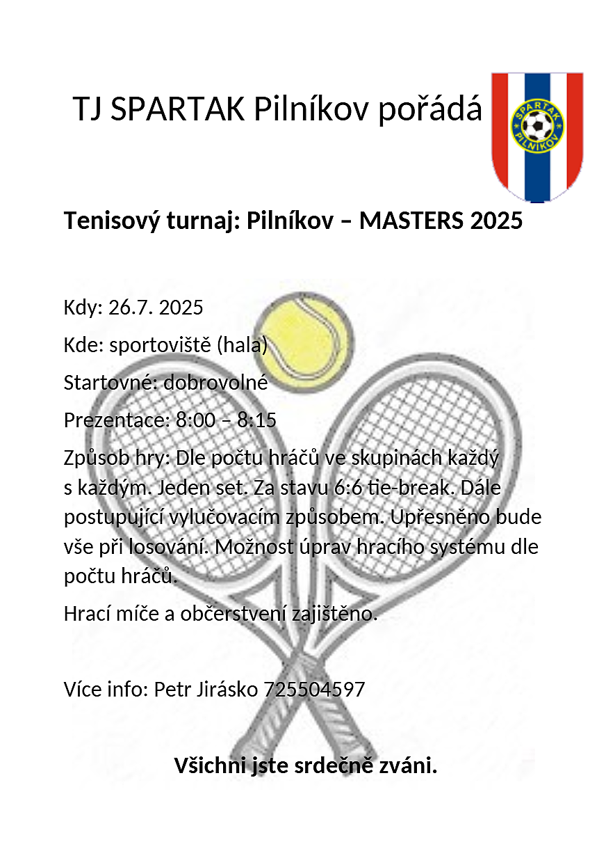 Poslední červencovou sobotu se v Pilníkově bude hrát tenisový turnaj "Pilníkov - MASTERS 2025".