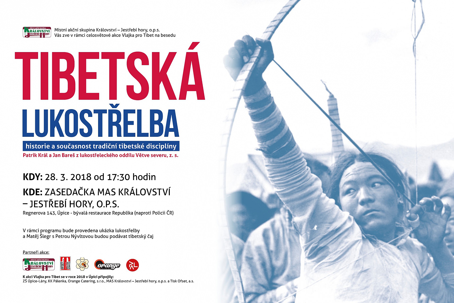 Přijďte 28. 3. 2018 od 17:30 hodin do bývalé restaurace Republika do Úpice. Je připravená tibetská lukostřelba, kterou představí Patrik Král a Jan Bareš z lukostřeleckého oddílu Větve severu z Hajnice. Bude se podávat tibetský čaj, který připraví Matěj Šlegr a Petra Nývltová. Více informací na plakátu.