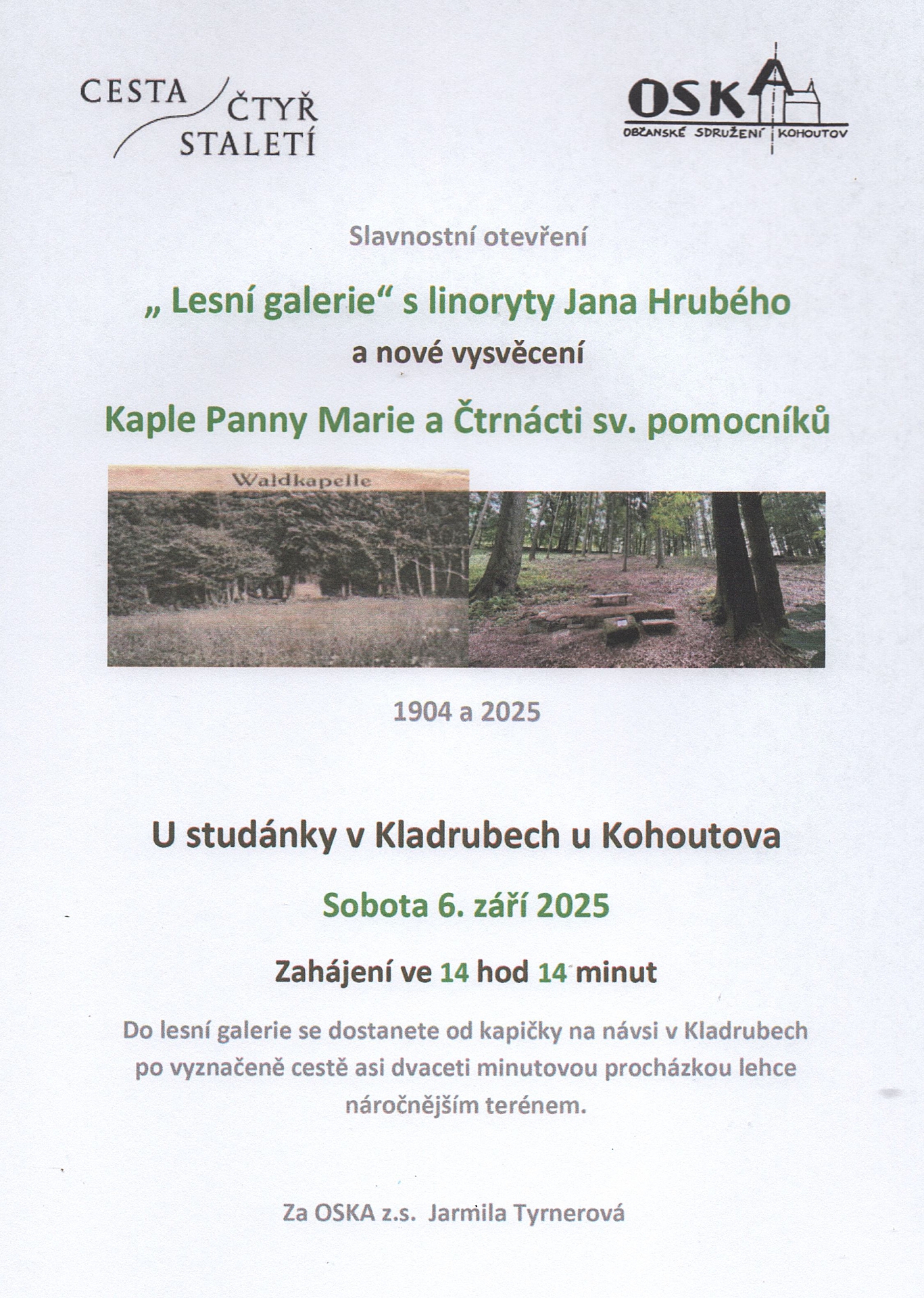 V sobotu 6. 9. 2025 ve 14:14 společně otevřeme Lesní galerii – místo, kde se příroda snoubí s uměním a kde každý krok vede k novému pohledu, tichu i inspiraci.