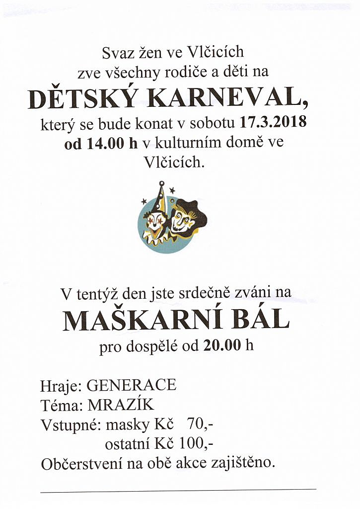 Svaz žen ve Vlčicích zve všechny rodiče a děti na Dětský karneval, který se koná v sobotu od 14:00 hodin v sále kulturního domu ve Vlčicích. V týž den jste srdečně zvání na Maškarní bál pro dospělé od 20:00 hodin. Více informací na plakátu.
