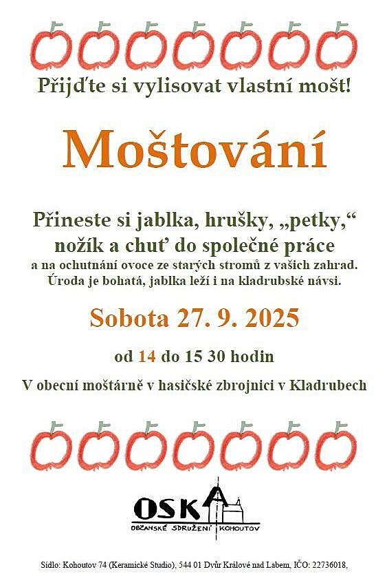 Přijďte si vylisovat vlastní jablka nebo se jen podívat, ochutnat čerstvý mošt a užít si voňavé podzimní dopoledne!