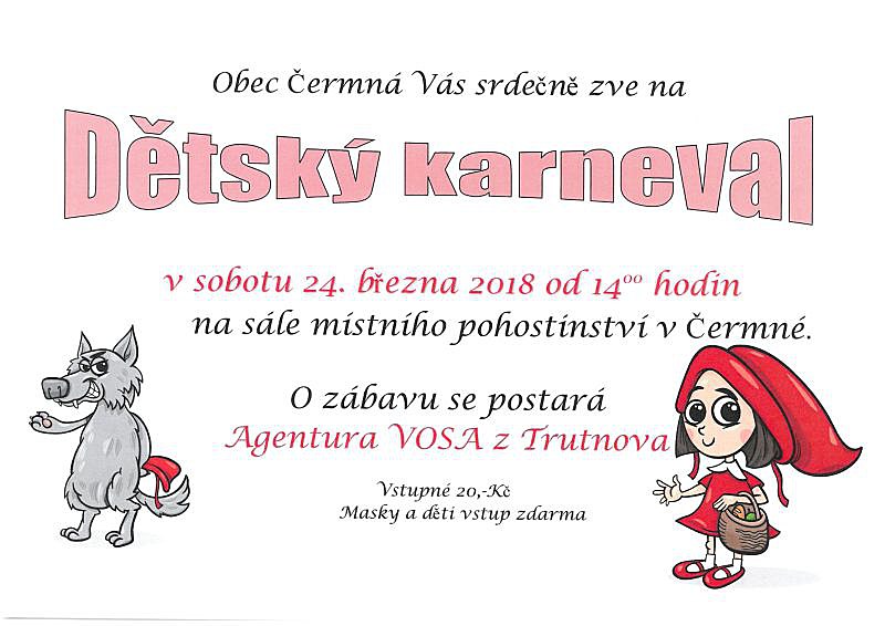 Obec Čermná Vás srdečně zve na Dětský karneval, který se koná v sobotu 24. března 2018 od 14:00 hodin na sále místního pohostinství v Čermné. Vstupné 20 Kč, masky a děti zdarma.