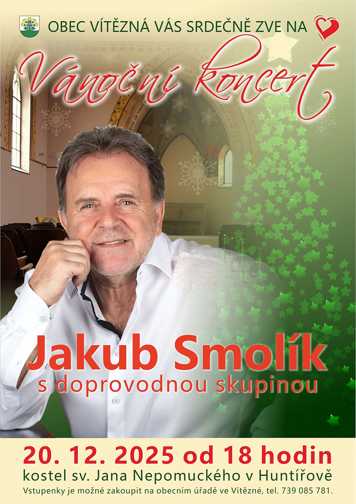 V sobotu 20. prosince 2025 od 18:00 hodin se v krásném prostředí kostela sv. Jana Nepomuckého ve Vítězné – Huntířově uskuteční jedinečný vánoční koncert populárního zpěváka Jakuba Smolíka a jeho kapely.