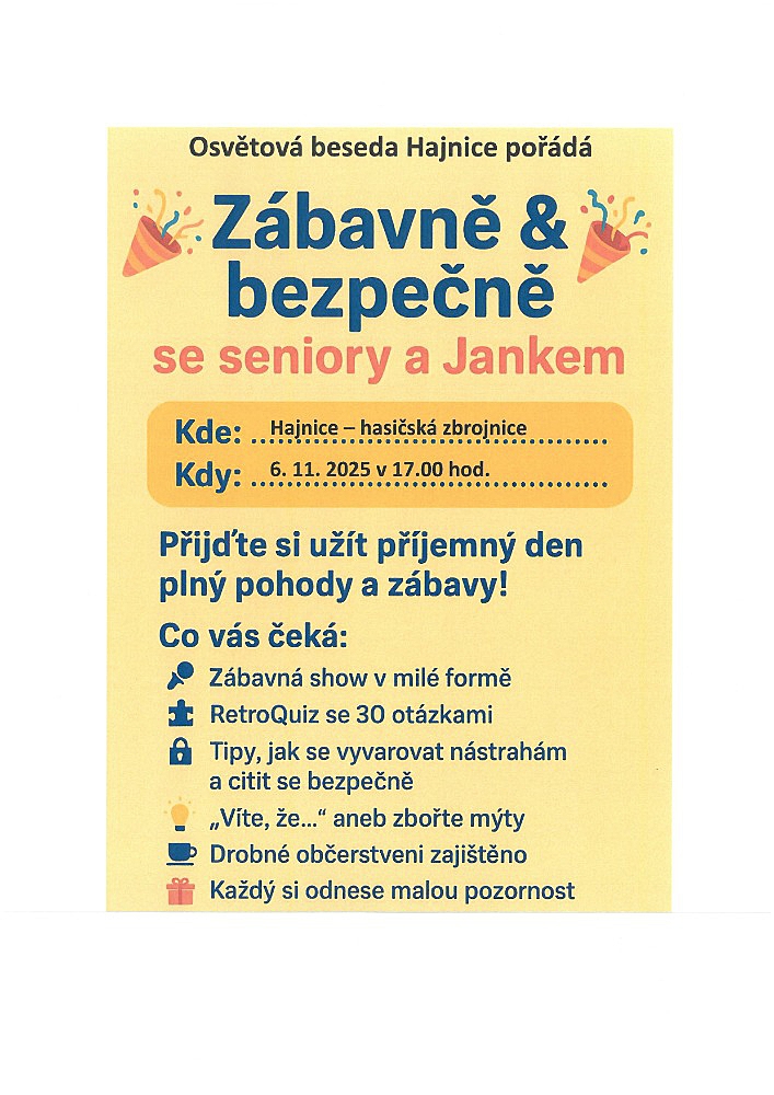 Srdečně vás zveme na pohodové odpoledne plné smíchu, hudby a zajímavých tipů, jak si užívat život naplno a zároveň bezpečně!