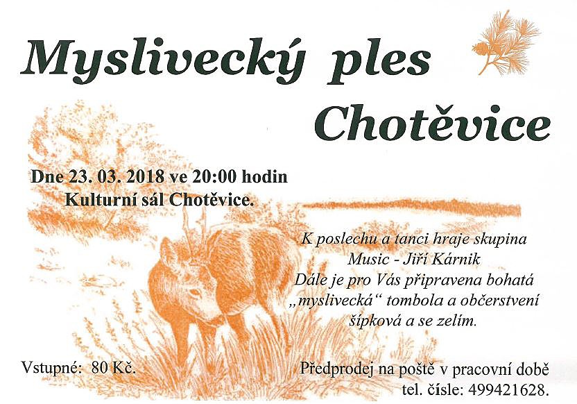 Přijďte se podívat 23. 3. 2018 do kulturního sálu v Chotěvicích na Myslivecký ples. K poslechu a tanci bude hrát skupina Music - Jiří Kárnik. Je také připravená tombola a občerstvení. Více informací na plakátu.