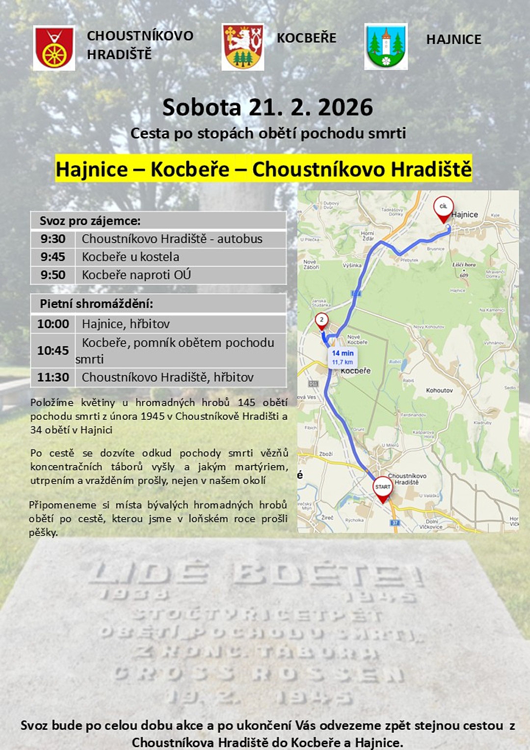 Každý rok v únoru se vracíme k tragickým událostem závěru druhé světové války, kdy naším krajem procházely tisíce vězňů z nacistických koncentračních táborů. Společně uctíváme památku těch, kteří v mrazu a vyčerpání nedošli do cíle své kruté cesty.