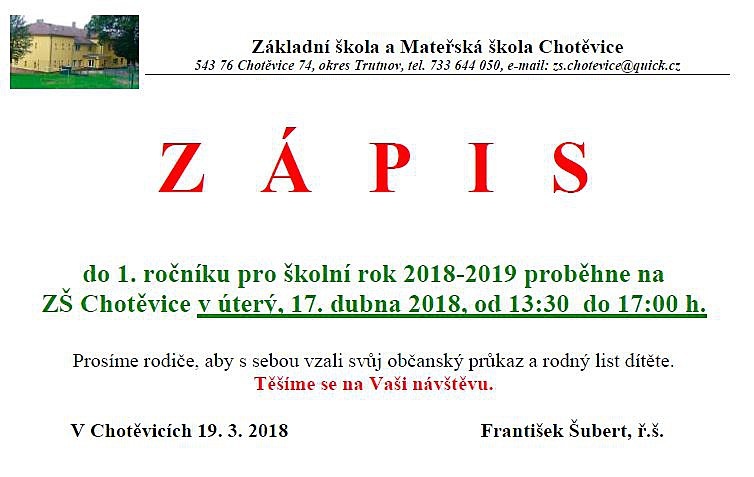 Zápis do 1. ročníku pro školní rok 2018-2019 proběhne na ZŠ Chotěvice 17. dubna