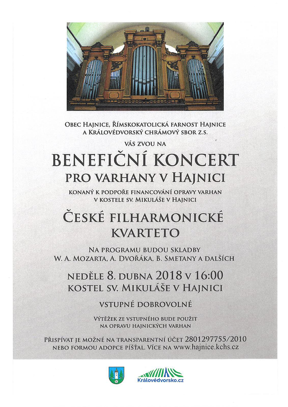 V nedeli 8. dubna 2018 od 16:00 proběhne v kostele sv. Mikuláše v Hajnici benefiční koncert pro varhany v Hajnici. Vystoupí české filharmonačké kvarteto a zahrají skladby od W. A. Mozarta, A. Dvořáka, B. Smetany a dalších. Vstupné je dobrovolné a bude použito na opravu varhan v kostele sv. Mikuláše v Hajnici. Více informací na plakátu.