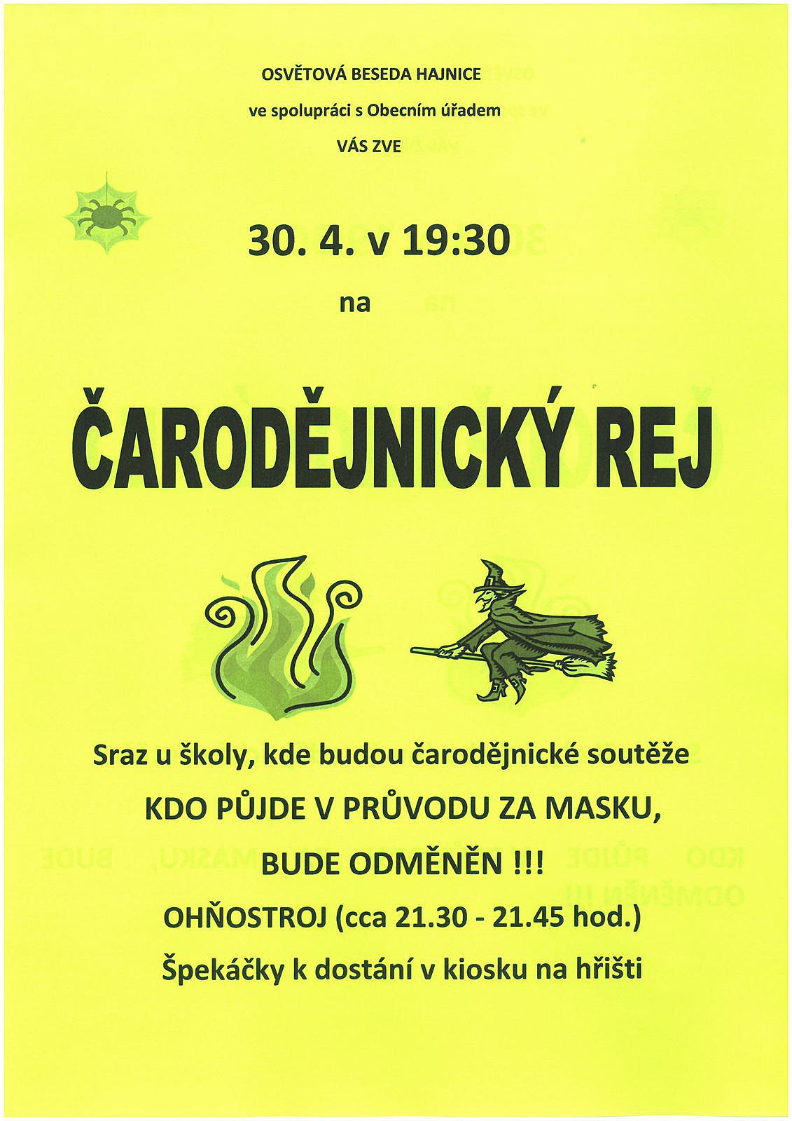 Osvětová beseda Hajnice ve spolupráci s Obecním úřadem Vás zve na Čarodějnický rej, který se koná v pondělí 30. 4. 2018 v 19:30. Sraz je u školy, každá maska bude odměněna. Více informací na plakátu.