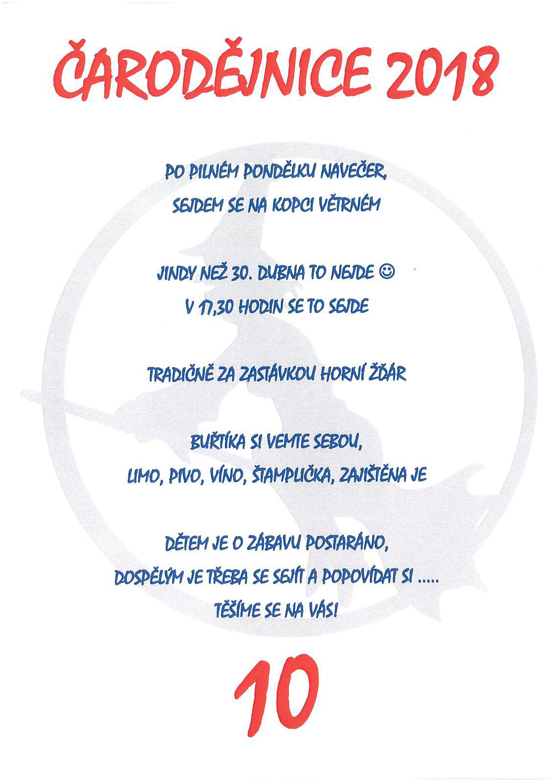 Přijďte si užít čarodějnický večer v Horním Žďáru! Sraz je v pondělí 30. 4. 2018 za zastávkou Horní Žďár v 17:30 hodin. Buřtíka s sebou, dobré pití a zábava pro děti jsou zajištěné.