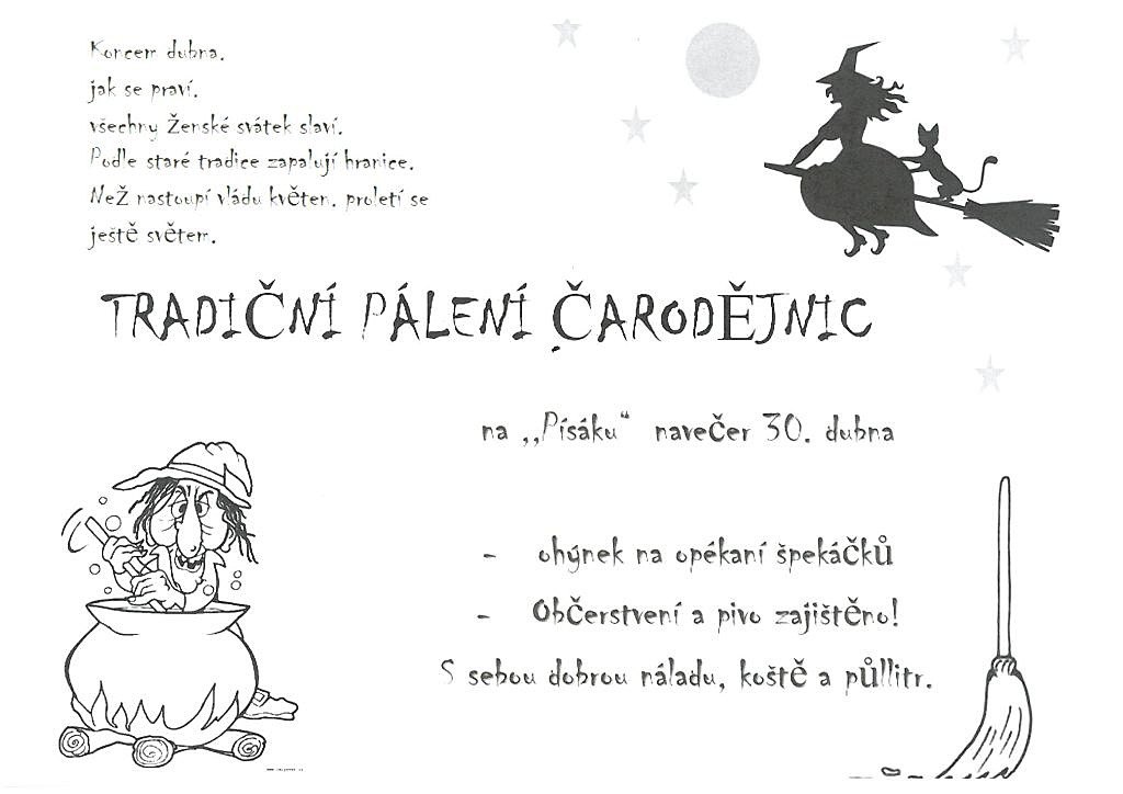 Tradiční pálení čarodějnic se koná v obci Čermná, navečer 30. 4. 2018 na "Písáku". Občerstvení zajištěno, s sebou dobrou náladu, koště a půllitr. Akci předchází stavění májky u obecního úřadu.