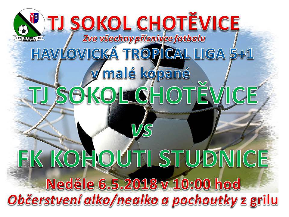 TJ Sokol Chotěvice zve všechny příznivce fotbalu na utkání v malé kopané TJ Sokol Chotěvice vs FK Kohouti Studnice, které se koná v neděli 6. 5. 2018 v 10:00 hodin. Bližší informace na plakátu.