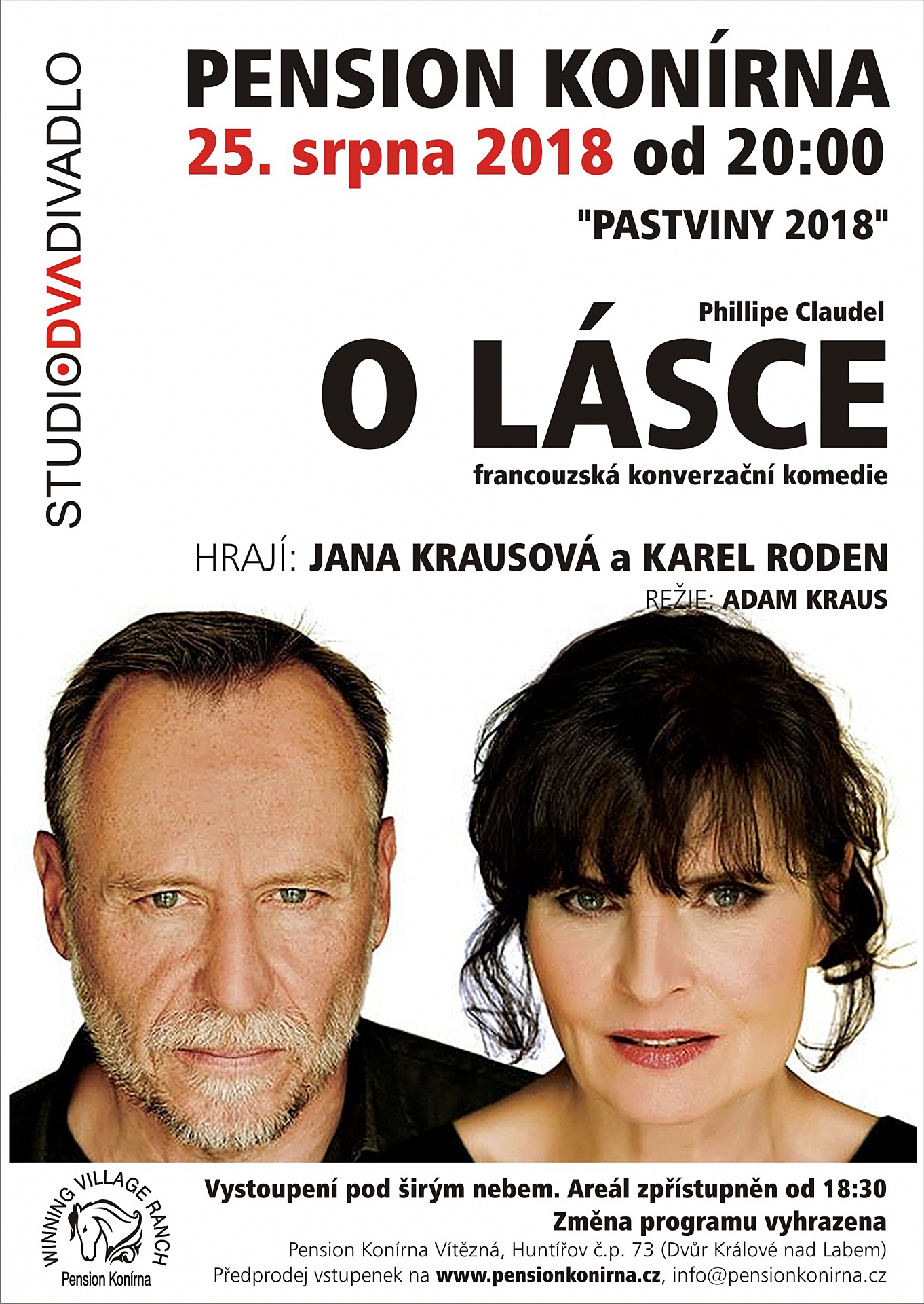 Přijďte 25. srpna 2018 od 20:00 do pensionu Konírna ve Vítězné na divadelní představení O lásce hrané pod širým nebem. Vystoupí Jana Krausová a Karel Roden. Divadelní hru zrežíroval Adam Kraus. Vstupenky si můžete zakoupit na internetových stránkách www.pensionkonirna.cz. Více informací na plakátu.