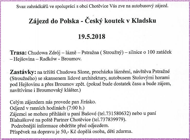 Svaz zahrádkářů ve spolupráci s obcí Chotěvice Vás zve na autobusový zájezd do Polska - Český koutek v Kladsku, který se bude konat v sobotu 19. 5. 2018. Těšit se můžete na zastávku na tržišti Chudowa Slone, návštěva Pstražné se skanzenem a cestu Stolovými horami. Celým zájezdem bude provázet pan Jirásko. Více informací na plakátu.
