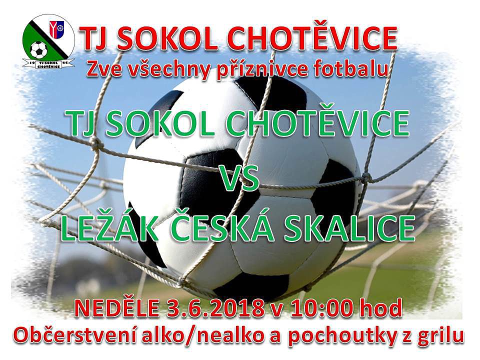 Nastoupí TJ Sokol Chotěvice proti Ležák České Skalice. Zápas proběhne 3.6.2018 od 10:00. Více informací na plakátu.