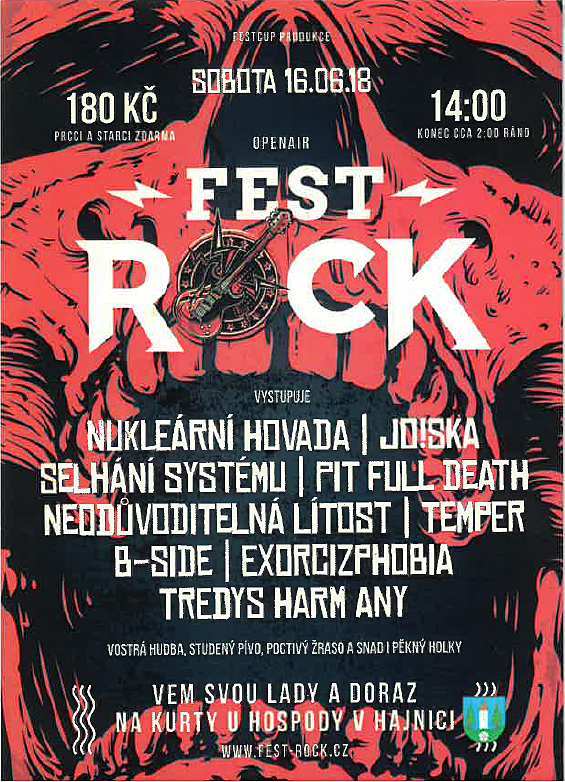 Festcup Produkce zve všechny milovníky poněkud ostřejší hudby na Openair Fest Rock, který proběhne v sobotu 16. června 2018 od 14:00 hodin na kurtech u hospody v Hajnici. Vstupné 180 Kč. Více info na plakátu.