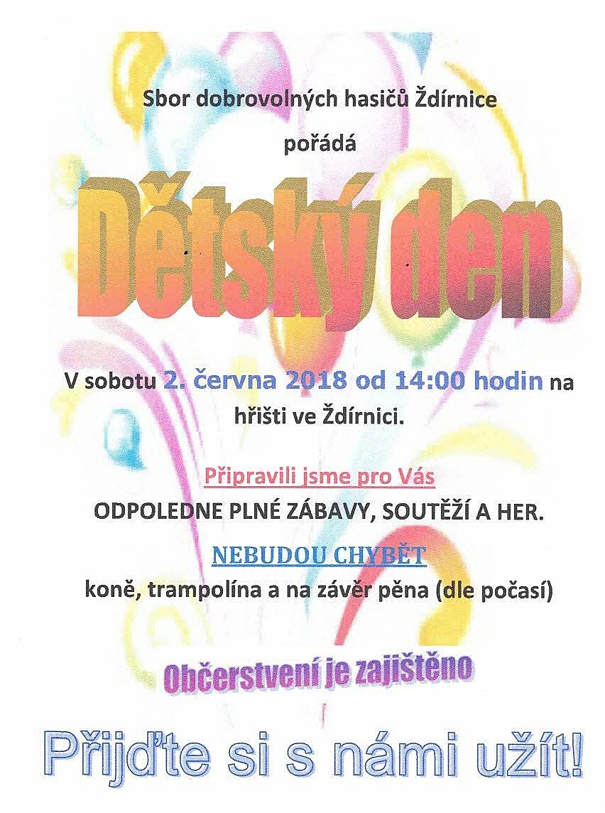V sobotu 2. června 2018 od 14:00 na hřišti ve Ždírnici v Horní Olešnice se koná dětský den. Je pro vás připraveno spoustu zábavy, soutěží, her, koně, trampolína a na závěr pěna. Občerstvení je zajištěno. Více informací na plakátu.