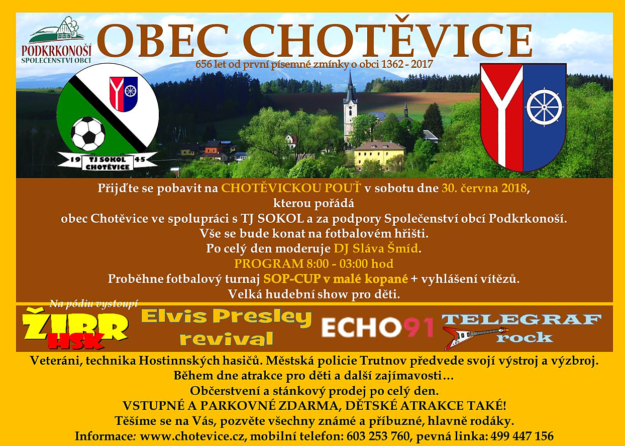 Obec Chotěvice ve spolupráci s TJ SOKOL a za podpory Společenství obcí Podkronoší pořádá chotěvickou pouť, která se koná v sobotu 30. 6. 2018 na fotbalovém hřišti. Program začíná v 8:00 hodin a potrvá až do nočních hodin. O zábavu se postará živá hudba, přehlídka hasičské a policejní techniky, těšit se můžete na atrakce pro děti. Více informací na plakátu a webu obce Chotěvice.