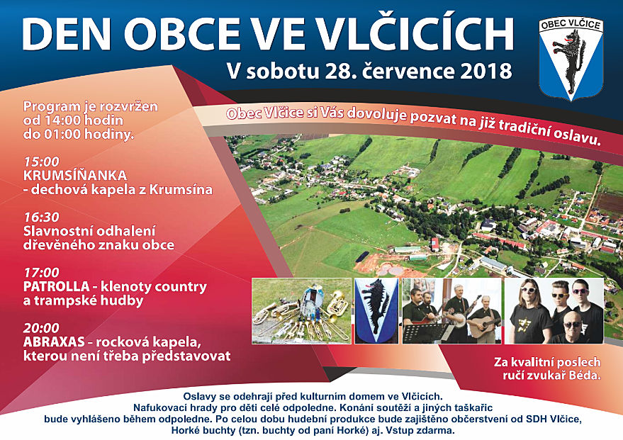 Obec Vlčice si Vás dovoluje pozvat na již tradiční oslavu dne obce Vlčice, která se koná v sobotu 28. 7. 2018 od 14:00 hodin u Kulturního domu. Na všechny čeká bohatý program, skvělé občerstvení a k poslechu zahrají dechová kapela Krumsíňanka, country kapela Patrolla a rocková kapela Abraxas. Více informací na plakátu.