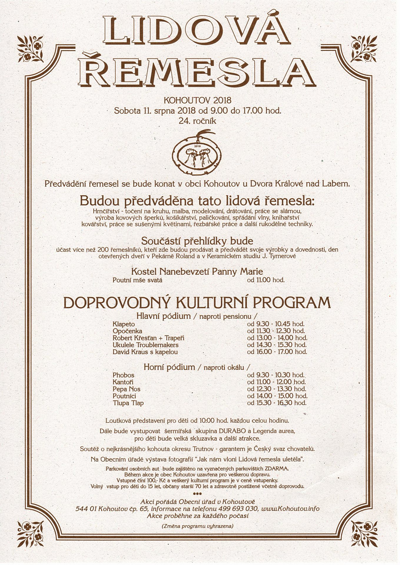Organizátoři Vás co nejsrdečněji zvou na již tradiční velmi oblíbenou akci pořádanou obcí Kohoutov s názvem Lidová řemesla. Tuto akci není třeba více představovat, přijďte se podívat!