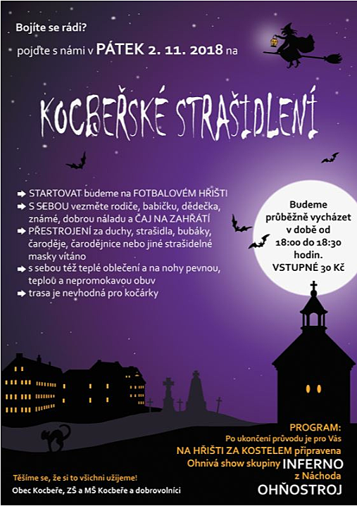 Obec Kocbeře Vás srdečně zve na tradiční Kocbeřské strašidlení. Akce pro "nebojsy" všeho věku se koná v pátek 2. 11. 2018 od 18:00 hodin. Sraz je na fotbalovém hřišti odkud se bude průběžně vycházet na strašidelnou trasu. Více informací na plakátě.