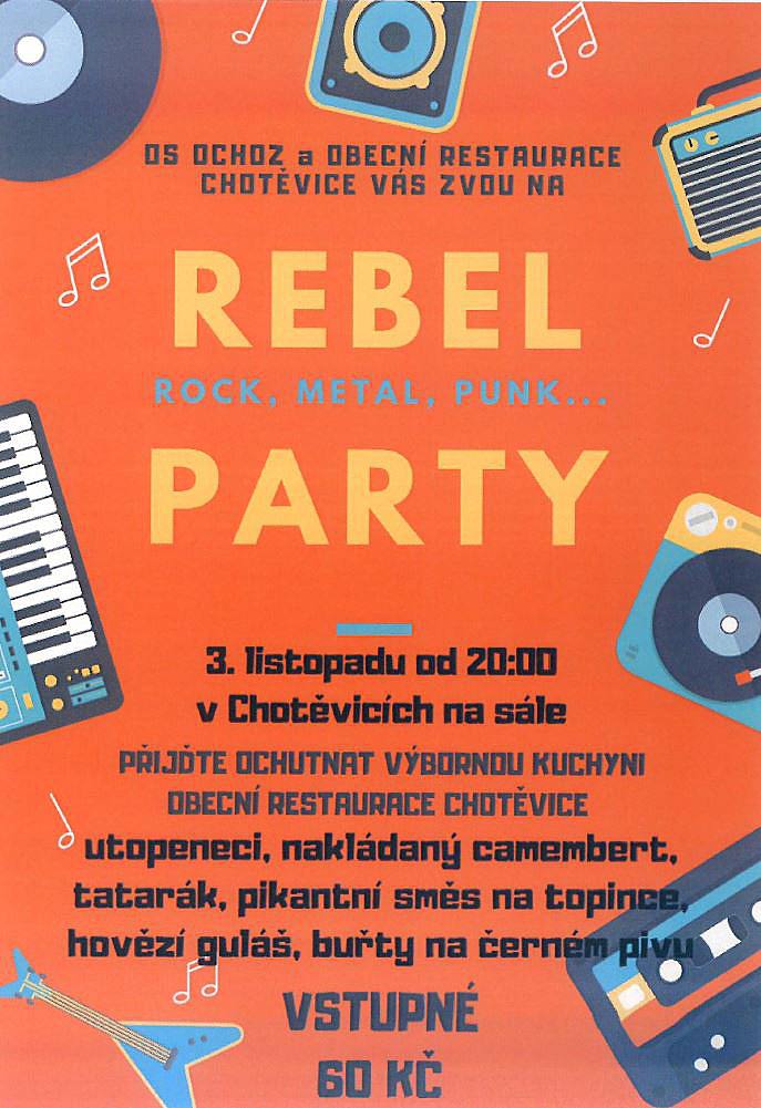 Občanský spolek Ochoz a Obecní restaurace Chotěvice vás srdečně zvou na Rebel Party, která se uskuteční v sobotu 3. 11. 2018 od 20:00 hodin na sále restaurace. Přijďte si užít rebelskou hudbu a pojíst něco specialit místní kuchyně!