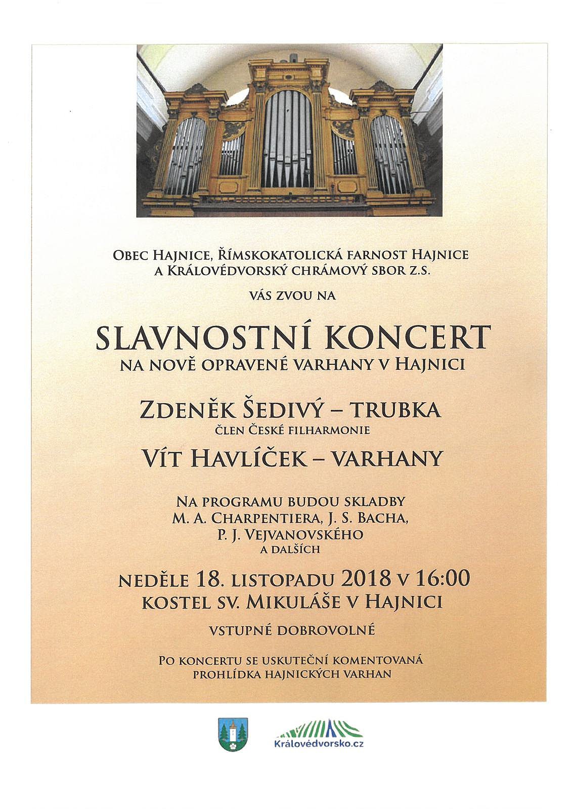 Ještě před rokem jsme zde zveřejňovali pozvánky na benefiční koncert pro varhany v Hajnici. Dnes s radostí uveřejňujeme pozvánku na slavnostní koncert na nově opravené varhany. Na akci srdečně zvou obec Hajnice, Římskokatolická farnost Hajnice a Královédvorský chrámový sbor z.s. Koncert se koná v neděli 18. 11. 2018 od 16:00 hodin v kostele sv. Mikuláše v Hajnici. Vstupné dobrovolné.