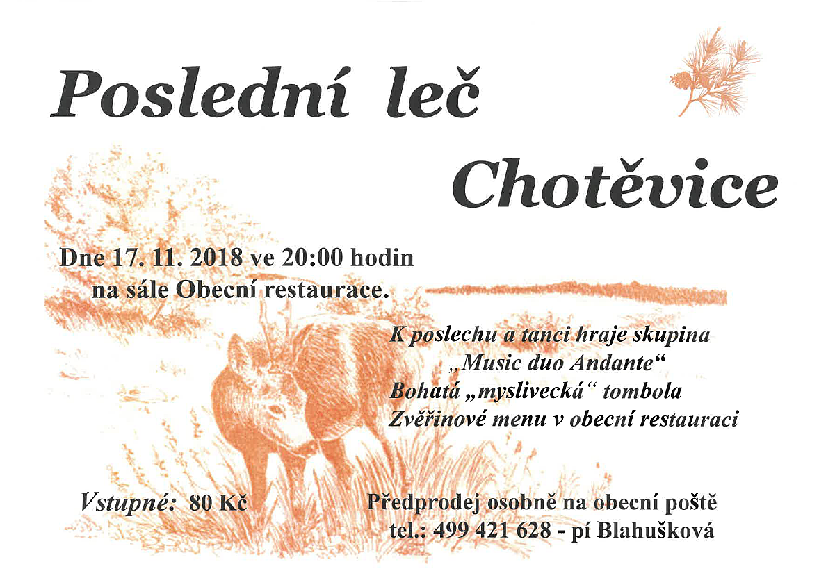 V sobotu 17. 11. 2018 se na sále Obecní restaruce v Chotěvicích koná Poslední leč. Akce začíná ve 20:00 hodin, k tanci i poslechu hraje skupina „Music Andante”, připravena je bohatá myslivecká tombola a lahodné zvěřinové menu v Obecní restauraci. Vstupné 80 Kč.