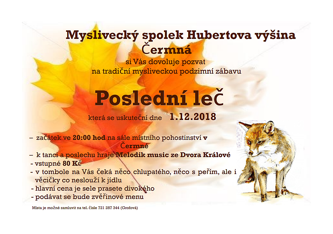 Myslivecký spolek Hubertova výšina si vás dovoluje pozvat na tradiční Poslední leč, která se koná v sobotu 1. 12. 2018 na sále místního pohostinství v Čermné. Připravena je bohatá tombola, podávat se bude zvěřinové menu. Začátek je ve 20:00 hodin, vstupné 80 Kč. K tanci i poslechu zahraje Melodik Music ze Dvora Králové.