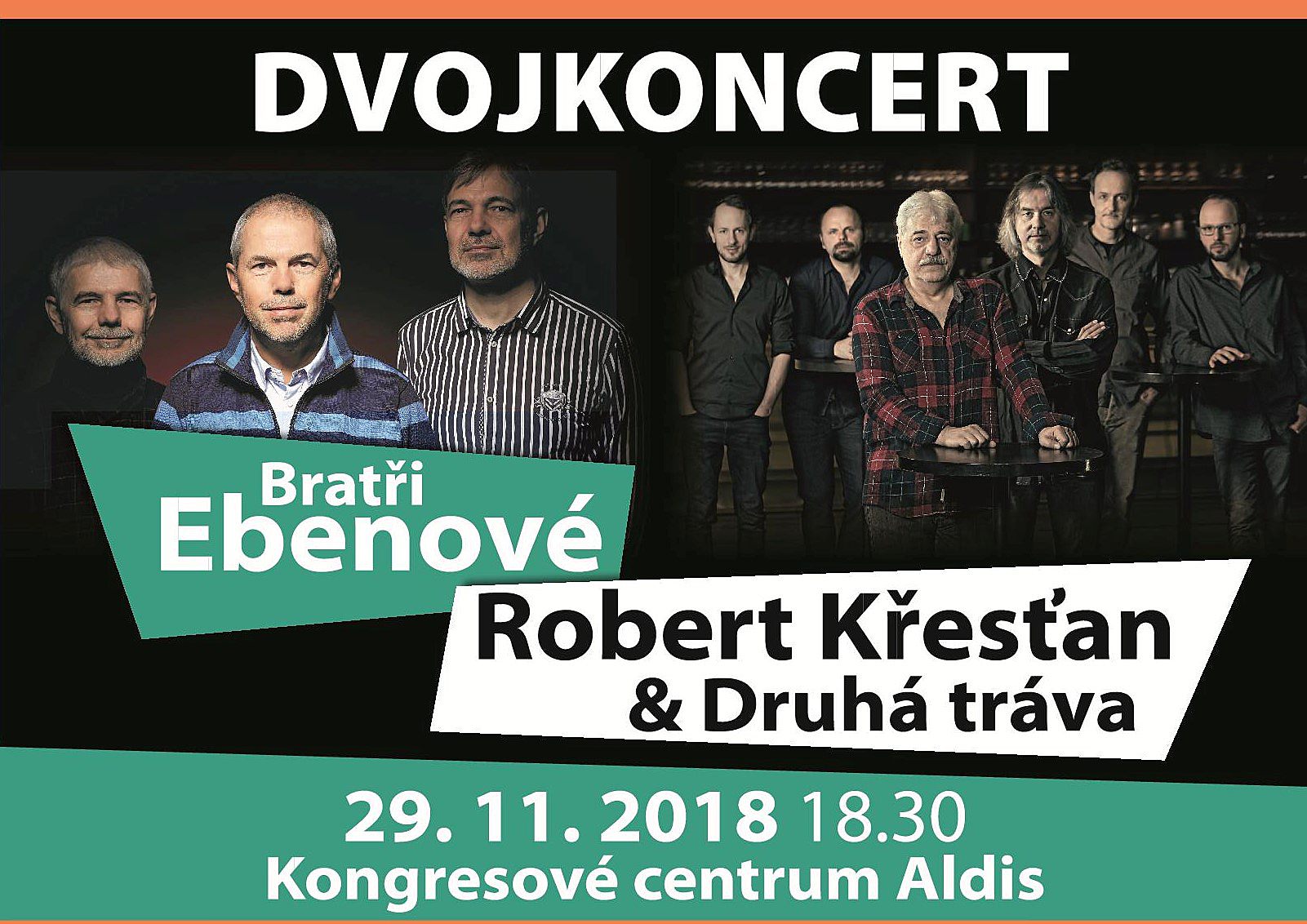 Ve čtvrtek 29.11. 2018 se na pódiu Kongresového centra Aldis v Hradci Králové potkají dvě výjimečné formace - Bratři Ebenové s kapelou a Robert Křesťan s Druhou trávou.