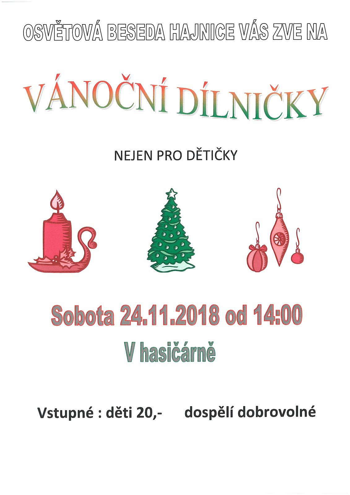 Osvětová beseda Hajnice vás zve na "Vánoční dílničky nejen pro dětičky". Sraz je v sobotu 24. 11. 2018 ve 14:00 hodin v hasičárně. Vstupné pro děti 20 Kč, pro dospělé dobrovolné.